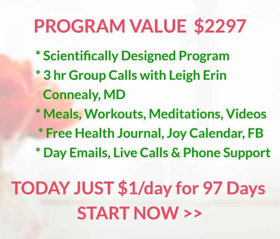 I really found program great, with so much knowledgeable input and valuable information. I love enthusiasm, understanding and willingness to help from both Dr Connealy and Reena on Live call sessions. Program is well put together without being overwhelming but with useful daily guidance and suggestions so it’s much easier to organize your day with morning meditations,plans for meals and exercise for each day. I’m very grateful !