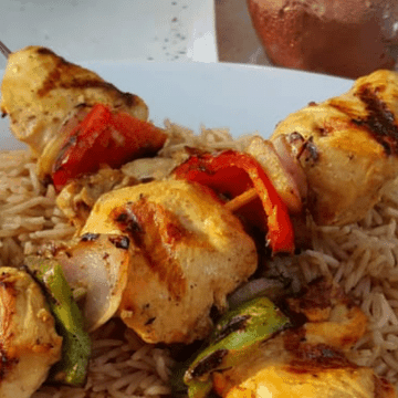 4 skewers of chicken with rice, one green salad with a side of dressing and bread